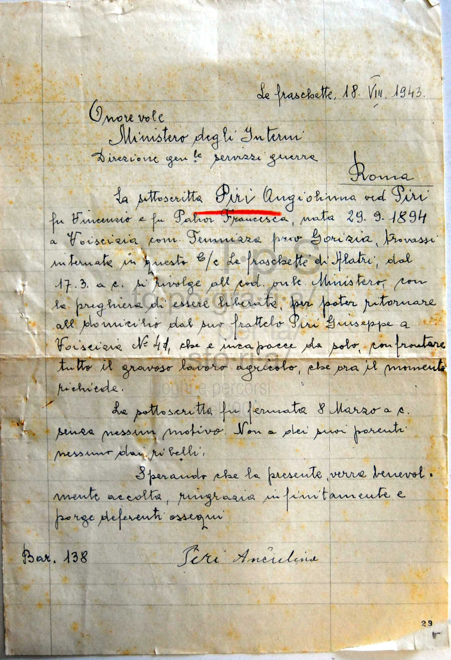 Piri Angelina figlia di Vincenzo e Pahor Francesca, nata a voiscizia a Gorizia