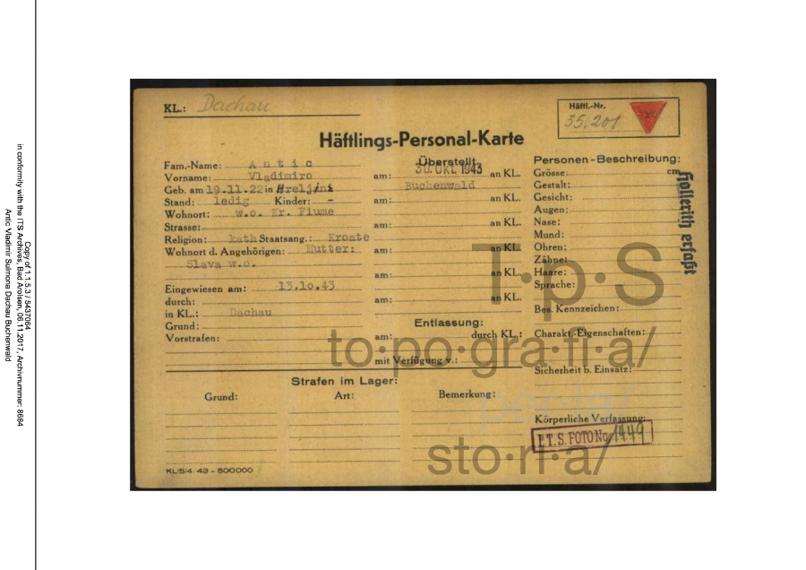 KL Dachau. Scheda personale del detenuto Vladimir Antić