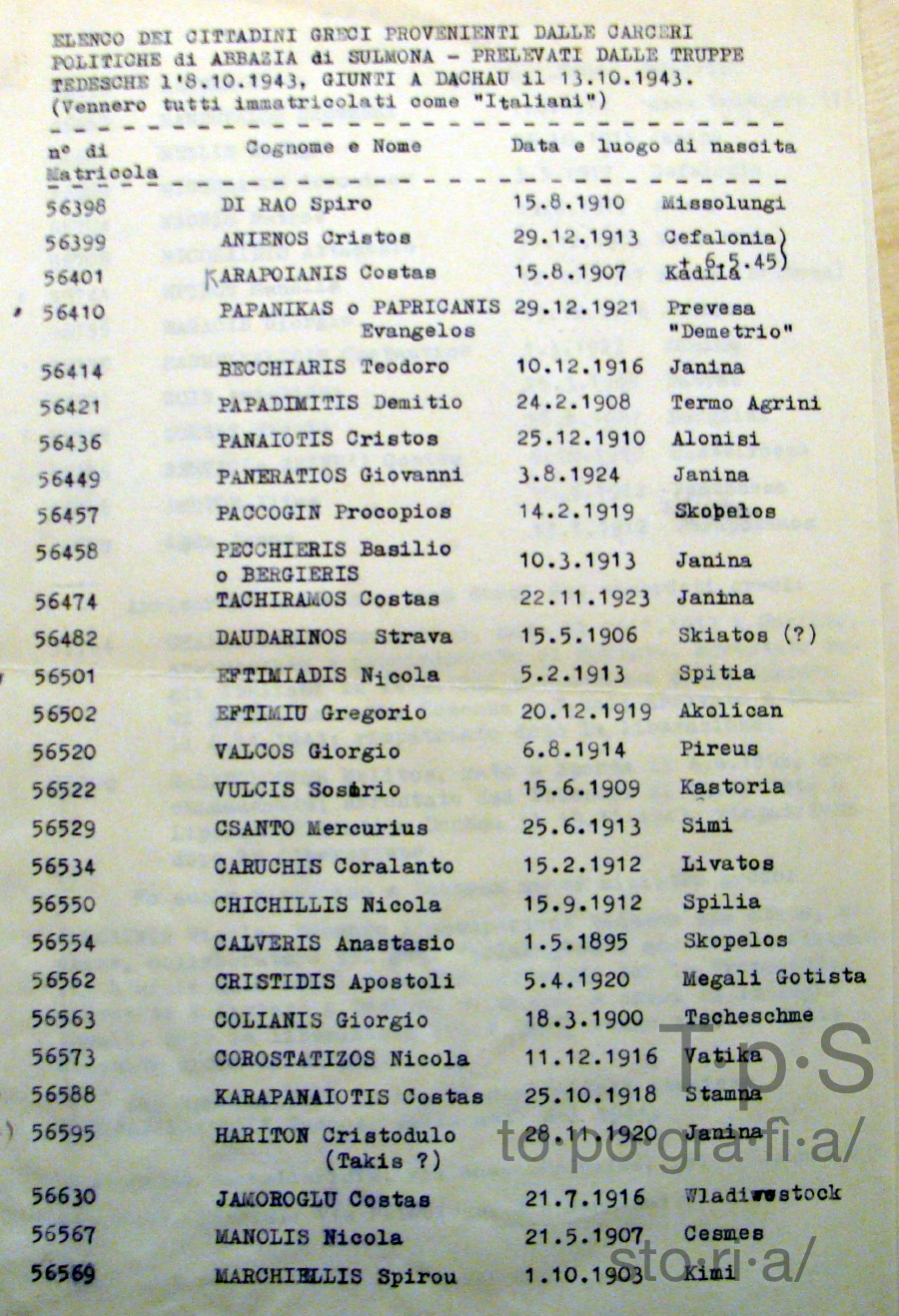Elenco dei cittadini greci prelevati dalla carceri di Sulmona e deportati a Dachau