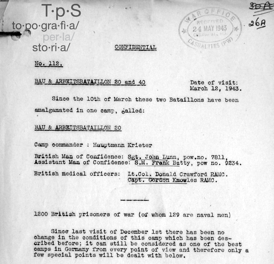 The National Archives (TNA), War Office. Casualties (PW), Bau-and Arbeitsbataillon 20 and 40, date of visit 12 March, 1943, Gabriel Naville, Dr. Aloys Schnieper WO 361/1871