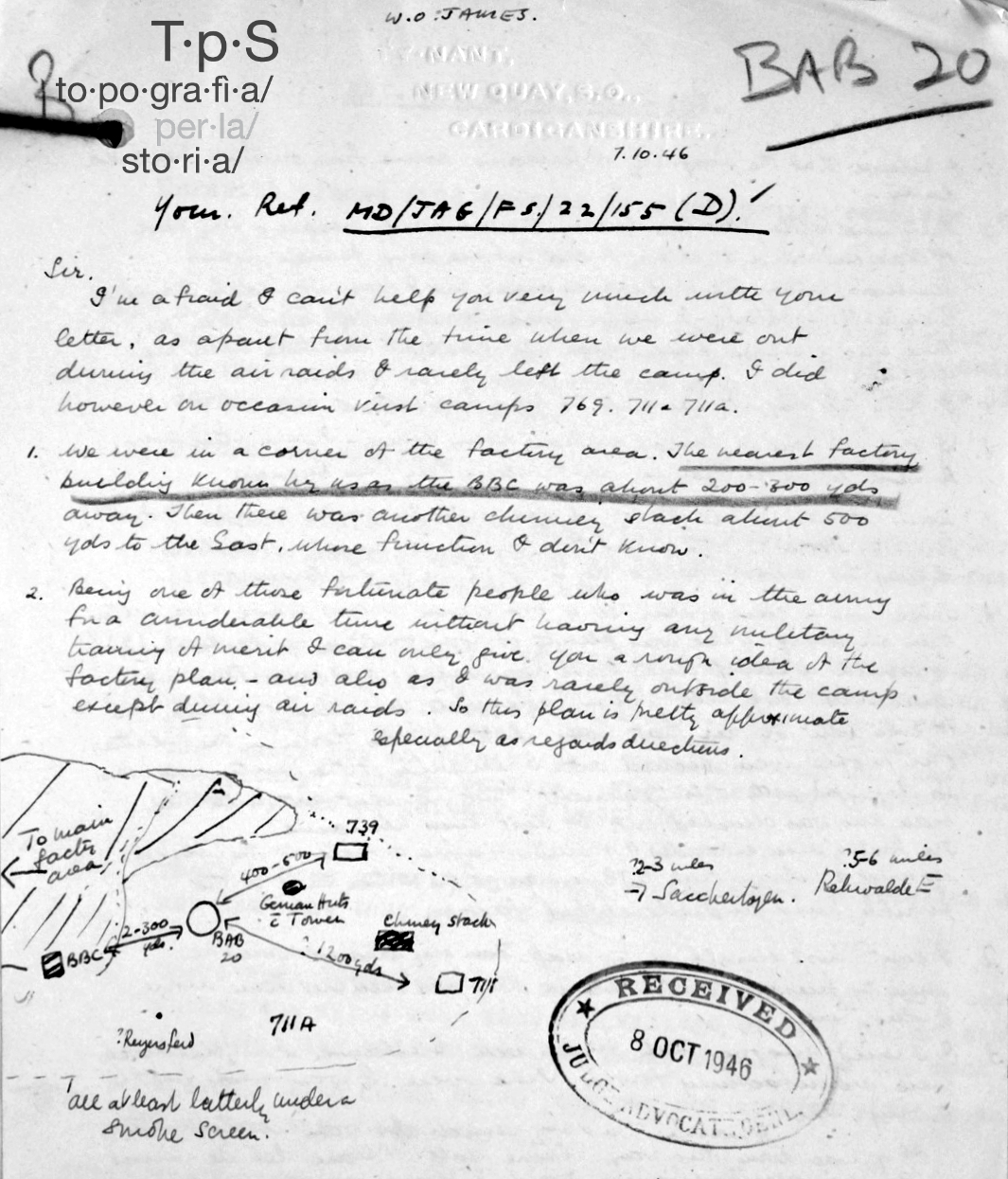 In una testimonianza rilasciata il 7 ottobre 1946, un ex prigioniero del Bau-und Arbeitsbatallion 20 (B.A.B. 20) afferma di aver avuto occasione di visitare il campo E 769. In un disegno che accompagna la sua dichiarazione, il distaccamento E 769 (erroneamente indicato come E 739) viene collocato a una distanza di circa 400-500 iarde dal B.A.B 20.2