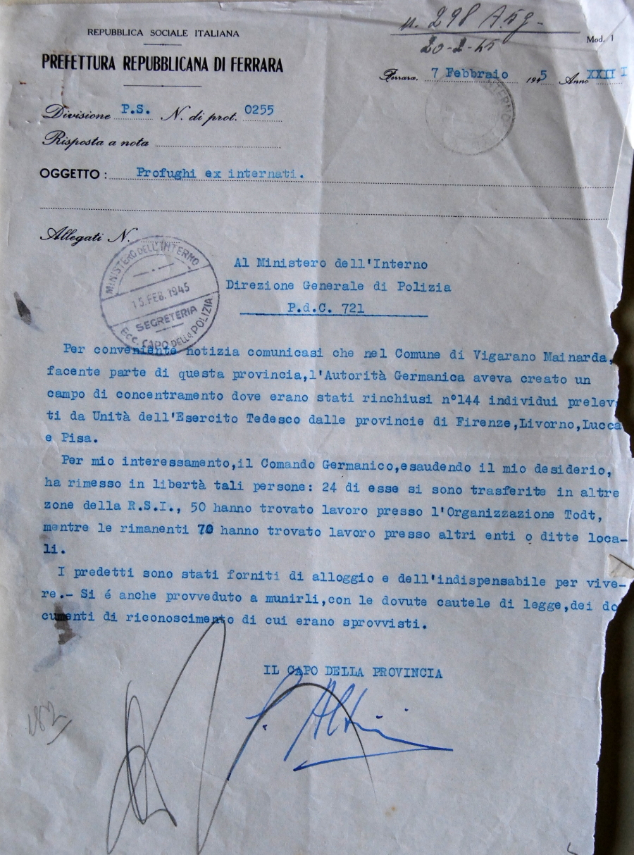 Il 7 febbraio 1945, il capo della provincia di Ferrara Giuseppe Altini comunica che è stato chiuso il campo di concentramento di Vigarano Mainarda.