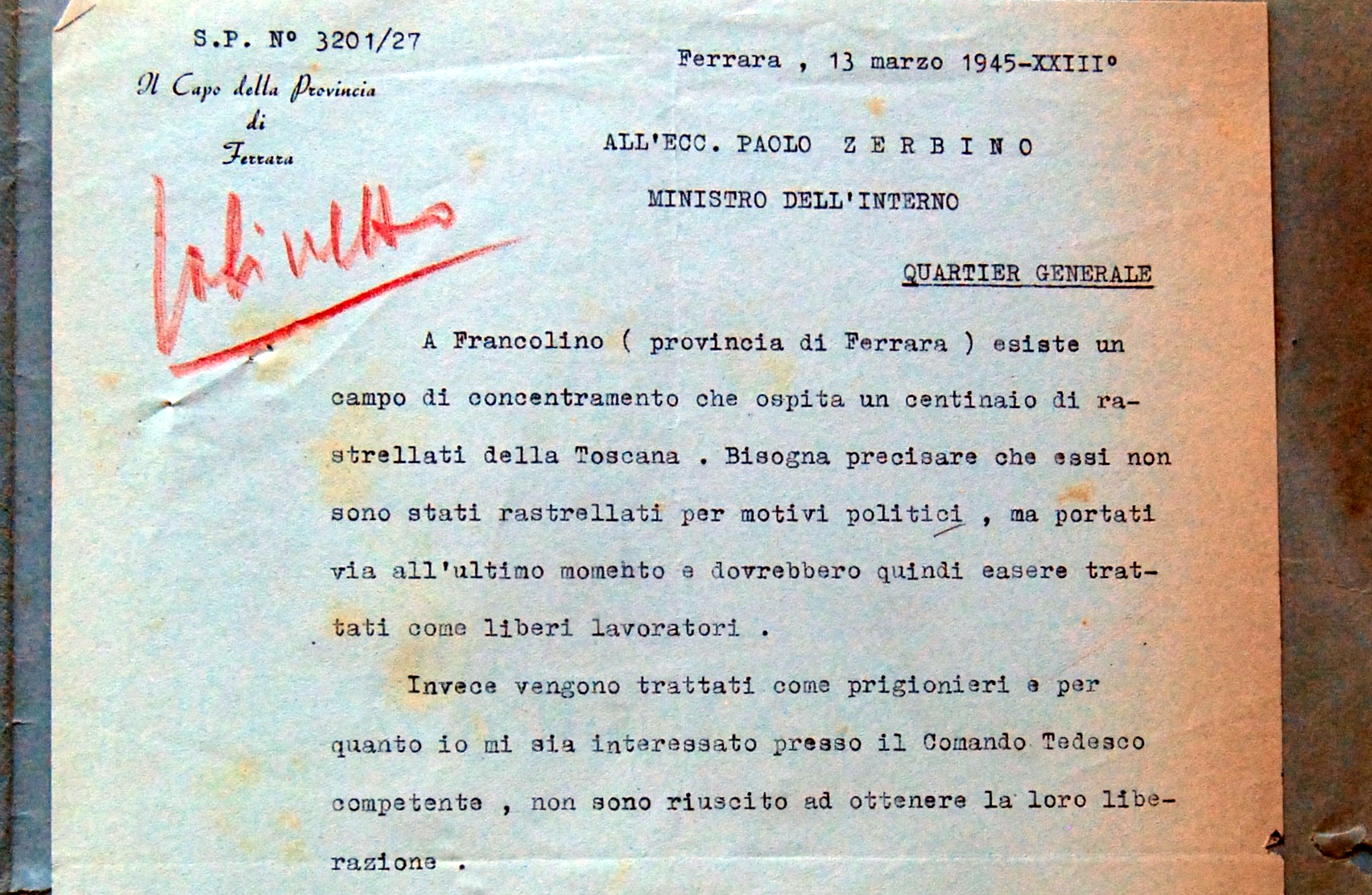 Il 13 marzo 1945, Giuseppe Altini, capo della provincia di Ferrara, scrive una lettera indirizzata al ministro dell'Interno della Repubblica sociale italiana, Paolo Zerbino, riguardo a un campo di concentramento in funzione in località Francolino.