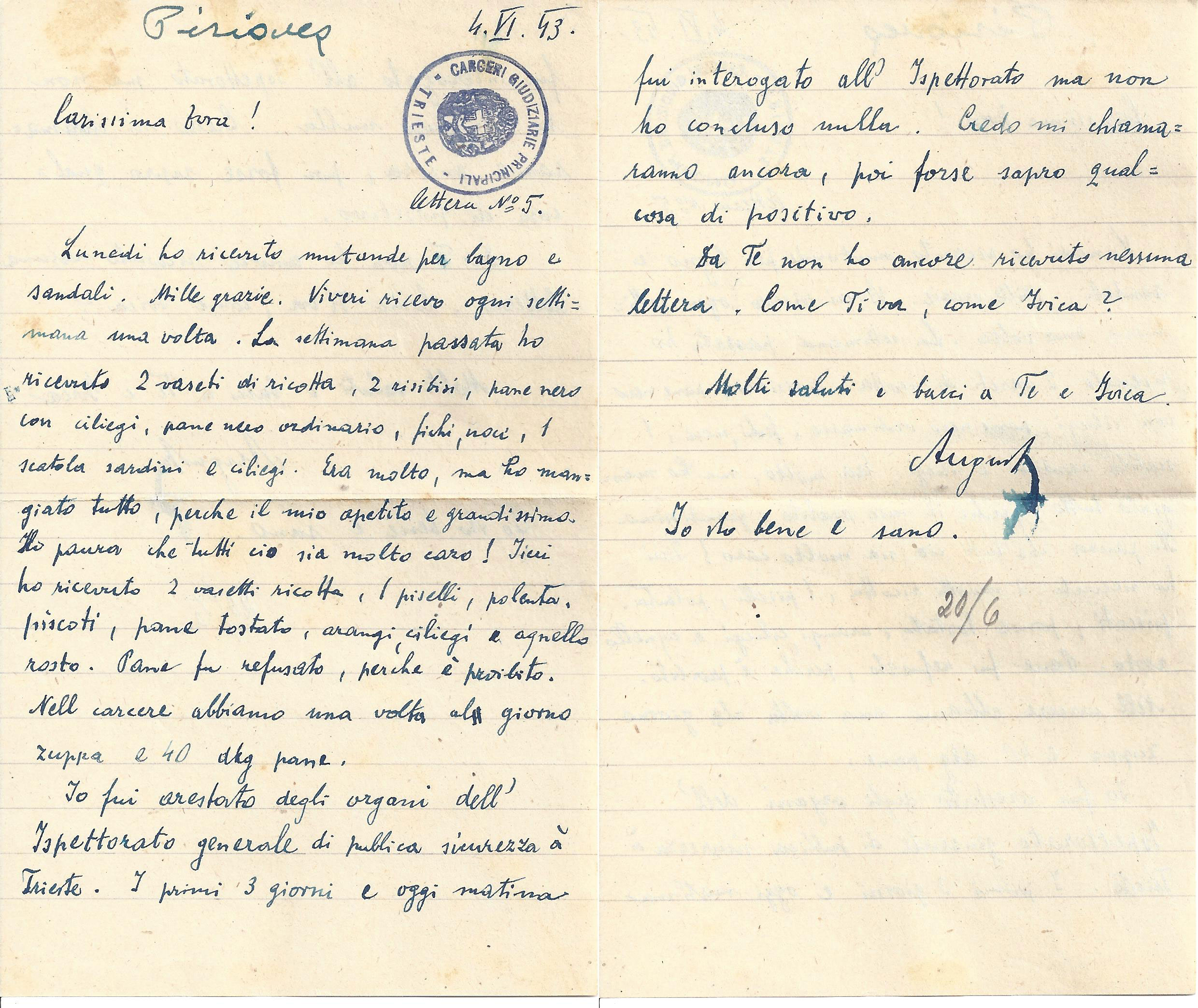 Finalmente riceve un pacco da Lubiana e ne scrive alla moglie. Riceve regolarmente beni alimentari e denaro. In carcere, il cibo è poco: una zuppa al giorno con riso o “maccaroni” e 4 etti di pane. In carcere può acquistare formaggio o salame una volta alla settimana, patate due, “caffelate” un giorno sì e uno no, e vino ogni giorno. Chiede ripetutamente di Ivica, la figlia. Apprendiamo che è stata arrestata. Sollecita i familiari a inviare pacchi di cibo anche a lei.
