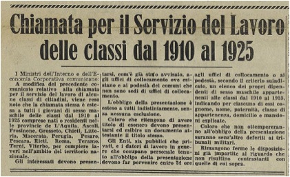 “The present situation imposes the binding necessity of carrying out work on roads, railways and other structures, in order to guarantee the continued transport of provisions and other essentials and to relieve the unemployment and suffering of the workers and their families, which could worsen with the onset of winter. For this reason I have decided to set up groups of workers organised by officers from the Engineers, in collaboration with the major national civil companies, who will be responsible for discipline, provisions, and the moral and physical well being of the workers. For this purpose a General Labour Inspectorate will be set up which will oversee the organisation and discipline of the workers. Any healthy male capable of carrying out such work, irrespective of age, may enrol. He will receive board and lodgings and a daily wage of 12,50 lire net as well as l.20 or his wife, l.5 for each child and l.10 for every dependent parent. Those interested should report to the Mayor's office, which will send a list of those who have been accepted to the relative prefect on a daily basis. Those workers who enrol will be exempted from any future call-up to the Armed Forces and will be employed within national boundaries, whenever possible in their own region. This recruitment will take place as from today. It will close as soon as the figure of 90,000 has been reached. Marshal R. Graziani, Minister of National Defence.”6