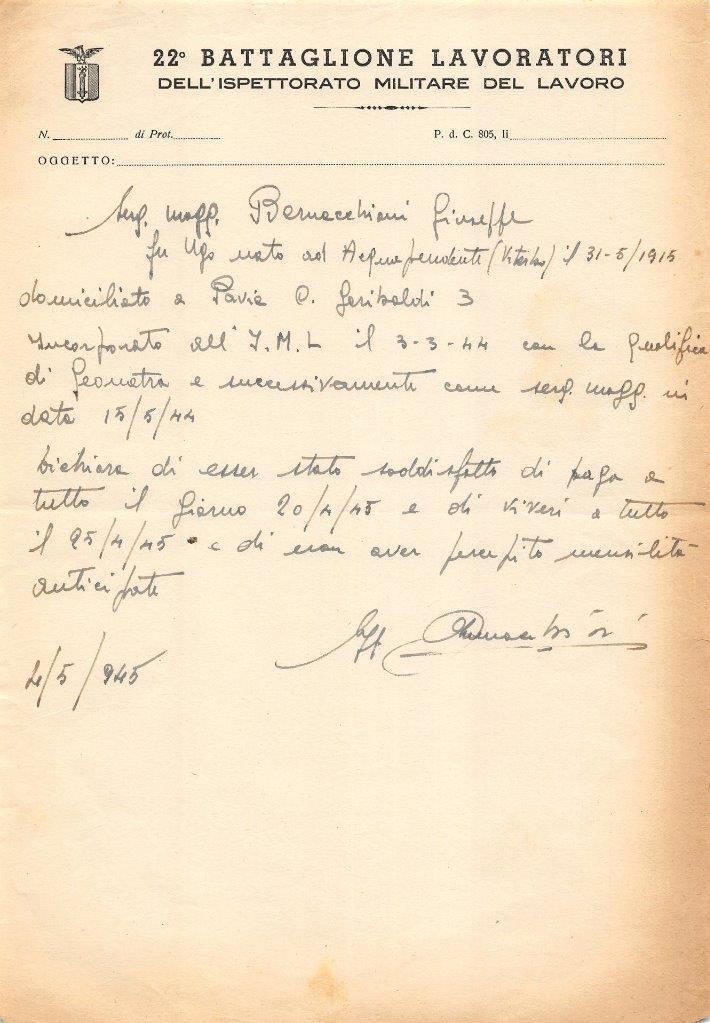 Clearly Paladino also wrote a letter to Farina: “ You must however convince yourself that is is not the fault of this I.M.L. if the labourers, compared with the 22,50 lire a day given to your fighting forces, earn 102 lire. This remuneration was fixed in a meeting between the Italians and the Germans, set up to examine the situation in which all the workers in the Social Republic found themselves and called by me, because the other organisations award higher wages than those given to my workers.” Paladino continued by asking Farina if he had any faith in his battalion or if it should be withdrawn.15