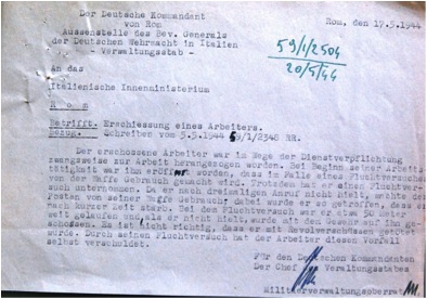 Working in the various militarised building operations brought with it a number of risks. Above all the discipline was very strict, given the military nature of the Inspectorate, and in addition the German supervisors had very few scruples about using force. For example, on 3 May 1944 a worker attempted to escape from a a German lorry which was passing through Casal Rotondo, near Rome. Three German soldiers belonging to the escort reached him and killed him on the spot.