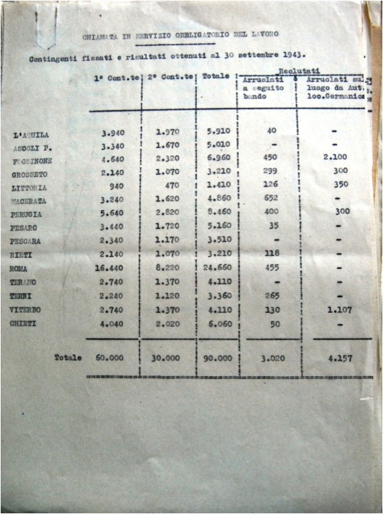 Il 25 settembre un rapporto del ministero dell’interno segnalava per la provincia di Perugia “Malgrado le più rigorose disposizioni impartite il reclutamento incontra gravissime difficoltà.” A Terni la paga era ritenuta insufficiente, moltissimi sfollati erano ancora fuori provincia e altri ancora erano, almeno teoricamente, sotto le armi. A L’Aquila, “Malgrado le più rigorose disposizioni impartite il reclutamento incontra gravissime difficoltà.” Ad Ascoli Piceno “il reclutamento del primo scaglione ha dato esito negativo.” Il tutto era dovuto non soltanto alla totale mancanza di collaborazione dei comandi tedeschi locali, che si rifiutavano di fornire automezzi e benzina, ma anche “alla convinzione dei lavoratori che saranno trasferiti in Germania.”3