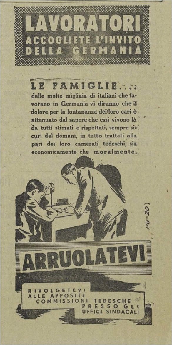 Il 29 novembre 1943, in una riunione a Roma, il console generale Möllhausen esordì attaccando violentemente i responsabili italiani del Servizio del lavoro: “Il console generale Muhlausen [sic] rileva che non è possibile parlare attualmente di alleanza italo tedesca allorquando i soldati germanici si battono sul fronte Sud d’Italia ed i giovani italiani non fanno letteralmente nulla.”7 La riunione si concluse con la proposta di ritirare la carte annonarie alle famiglie dei richiamati.
