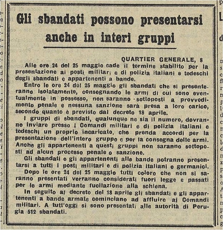 I comandi locali militari locali talvolta prendevano iniziative che andavano direttamente in contrasto con le leggi della RSI. Nel dicembre del 1944, nel cuneese, un ufficiale della Wehrmacht promise ai partigiani (anche ai disertori) che, se si fossero presentati, sarebbero stati inviati al lavoro, in Italia, senza alcuna sanzione.16 Al volantino era allegato un lasciapassare che diceva: “per coloro i quali si consegneranno colle loro armi al più vicino posto italo-germanico per tornare alle loro case e riprendere il lavoro in Italia. Il Comando Italo-Germanico ha preso accordi con il Governo Italiano e garantisce protezione e libero passaggio a chiunque si sarà presentato consegnando le armi.”