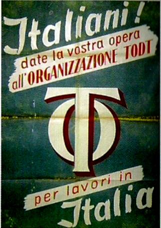 L’organizzazione Todt nacque in Germania alla fine degli Trenta, allo scopo di organizzare la forza lavoro per la costruzione di installazioni militari. Ideata e diretta da Fritz Todt fino alla sua morte (1942), durante la guerra venne utilizzata per lo sfruttamento dei lavoratori coatti nei paesi occupati dalla Germania. In Italia ebbe un ruolo fondamentale nella costruzione delle linee di difesa lungo l’Appennino per la Wehrmacht, inquadrando decine di migliaia di uomini.