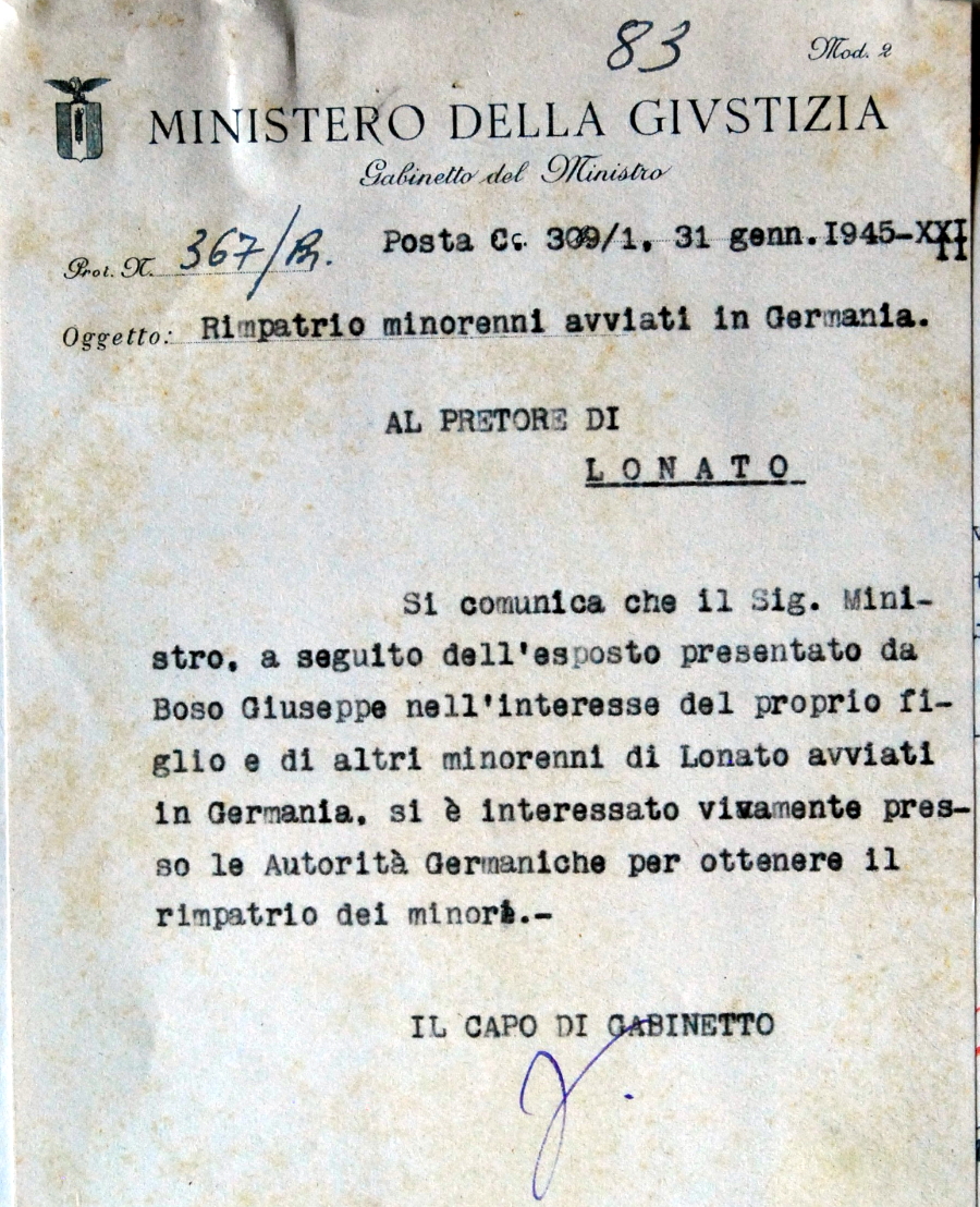 L'8 gennaio 1945 Giuseppe Boso invia un appello al Ministro delle Giustizia della Repubblica Sociale Italiana, Piero Pisenti. Boso invoca l'intervento delle autorità repubblichine per ottenere la liberazione di 19 persone, tra cui suo figlio, il sedicenne Augusto Boso, arrestate dalle autorità tedesche a Lonato, in provincia di Brescia, il 2 settembre 1944 per attività sovversiva.