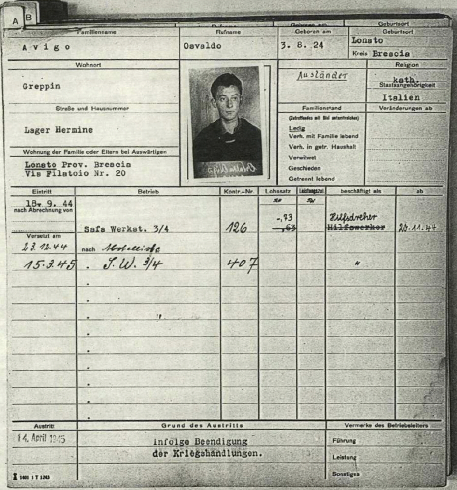 - Angelo Fiume (32 anni) e Giordano Podavini (16 anni) - la cui scheda gli attribuisce la professione di "scolaro" - lavorano per la IG-Farben AG a Bitterfeld.5