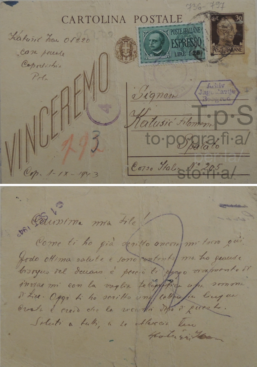 One means of communication was by way of postcards, which the prisoners were allowed to send occasionally to relatives and friends. Although subject to censorship, they did allow, up to a point, the families of the detainees to be informed as to their state of well-being and their movements. In this way it was possible to learn of their transfer to Germany, from where, until the last phase of the conflict, they managed to send their news.