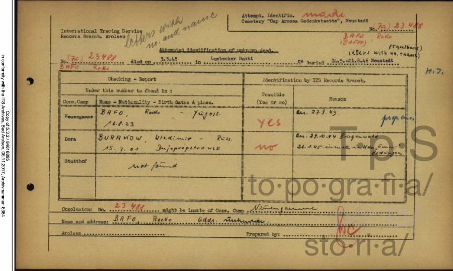 The documentation held by the International Tracing Service confirms the route given in these accounts, even if the dates of arrival vary slightly. Some registration cards give the departure date as 13 September and the arrival in Neuengamme on the 24th of the same month16. Other internees were instead registered as being present in Neuengamme only on 27 September17.