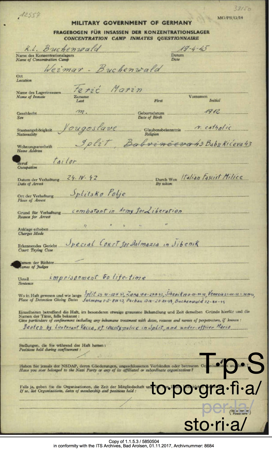 Dichiarazioni di Frano Mihaljević e di Ante Kuzmanić, Archivio di Stato di Spalato, Spalato, Gradska komisija za ispitivanje zločina okupatora i njihovih pomagača [Commissione cittadina per l’indagine sui crimini degli occupanti e dei loro collaboratori], HR-DAST-412, 1945, k. 10.