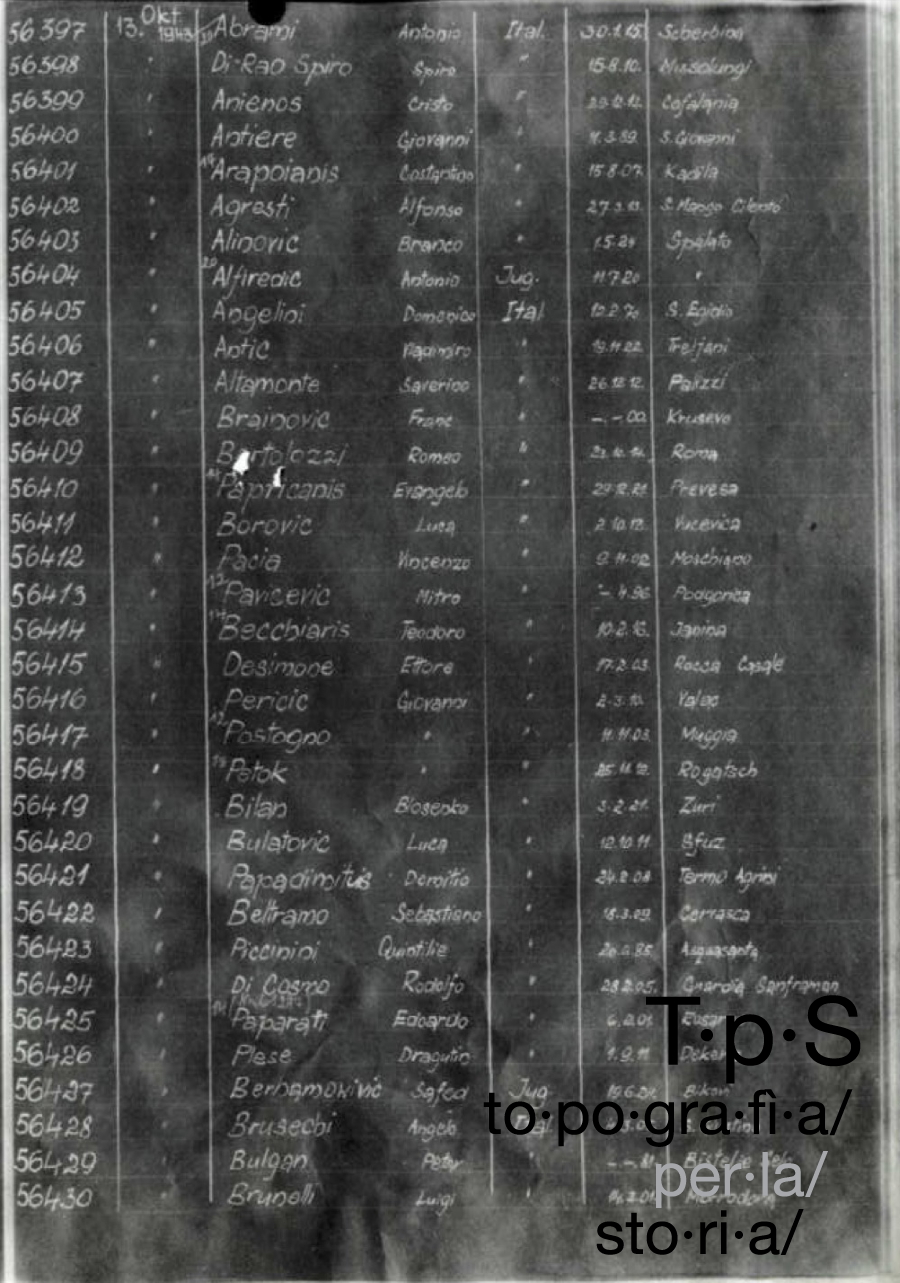 Un centinaio di deportati jugoslavi provenienti dal carcere di Sulmona, dopo tre settimane di quarantena trascorse a Dachau, fu inviato al campo di Buchenwald, dove arrivò il 30 ottobre 194327. Secondo la testimonianza di Ivan Voljč, nativo di Lubiana, gli jugoslavi furono uniti a un trasporto di circa 2.000 persone, all'interno del quale si trovavano ucraini e internati militari italiani28. A Buchenwald confluirono anche altri "doppi deportati" jugoslavi provenienti da carceri e campi fascisti, come Perugia e Renicci, oltre a numerosi altri civili deportati dai tedeschi dall'Istria e da Trieste, composti in prevalenza da simpatizzanti o attivisti della resistenza. Dalle liste nominative si evince il totale di 3.872 jugoslavi transitati nel campo di Buchenwald, ma secondo alcuni studiosi questa cifra sarebbe da intendere per difetto29.