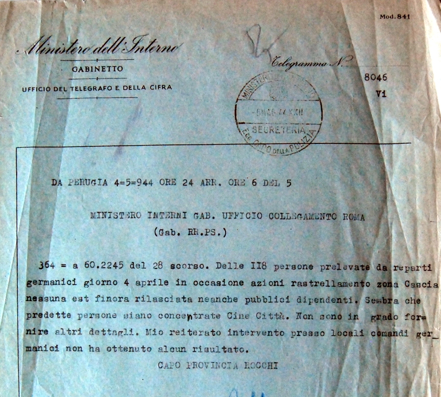 Anche nella provincia di Perugia si ebbero alcuni rastrellamenti di lavoratori. Il 28 marzo 1944, da Cascia, furono prelevate 118 persone che furono inviate nel campo di concentramento di Cinecittà.6