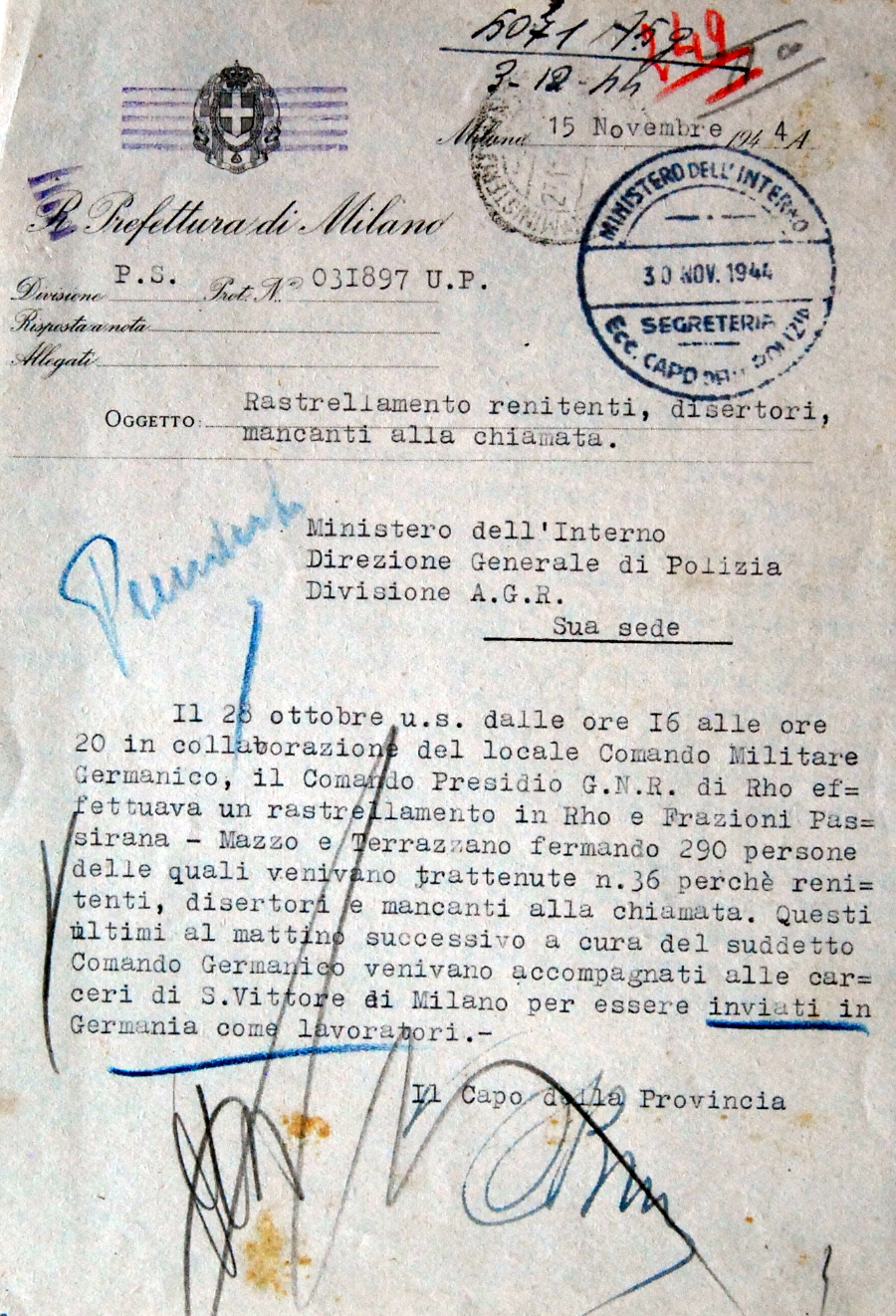 Le operazioni antipartigiane della Wehrmacht portavano spesso al rastrellamento di uomini che venivano poi inviati al lavoro coatto in Germania. Ad esempio a Rho (Milano), il 28 ottobre 1944, la Gnr locale, in collaborazione col comando militare tedesco, “effettuava un rastrellamento in Rho e frazioni Passirana – Mazzo e Terrazzano fermando 290 persone delle quali venivano trattenute n.36 perché renitenti, disertori e mancanti alla chiamata. Questi ultimi al mattino successivo a cura del suddetto Comando Germanico venivano accompagnati alle carceri di S. Vittore di Milano per essere inviati in Germania come lavoratori.”19